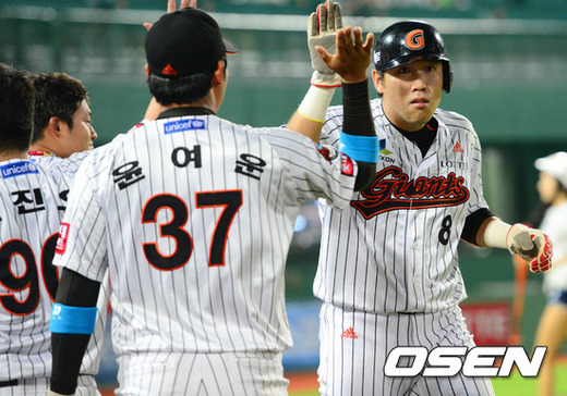 4일 오후 부산 사직구장에서 열린 '2012 팔도 프로야구' 롯데 자이언츠와 KIA 타이거즈의 경기 7회말 2사 만루 손아섭의 3타점 2루타에 홈을 밟은 2루주자 전준우가 덕아웃에서 동료들과 하이파이브를 하고 있다.
