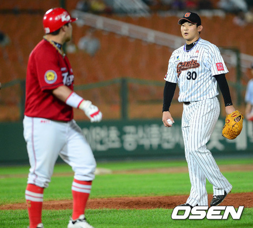 4일 오후 부산 사직구장에서 열린 '2012 팔도 프로야구' 롯데 자이언츠와 KIA 타이거즈의 경기 8회초 무사 1루 나지완이 최대성의 투구에 몸을 맞고 1루로 나가면서 최대성을 바라보고 있다.
