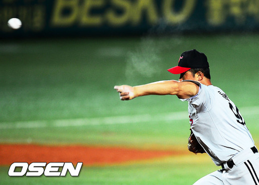 4일 오후 대구 시민구장에서 열린 '2012 팔도 프로야구' 삼성 라이온즈와 LG 트윈스의 경기에서 7회말 2사 주자 없는 상황에서 마운드에 오른 LG 류택현이 힘차게 공을 뿌리고 있다.