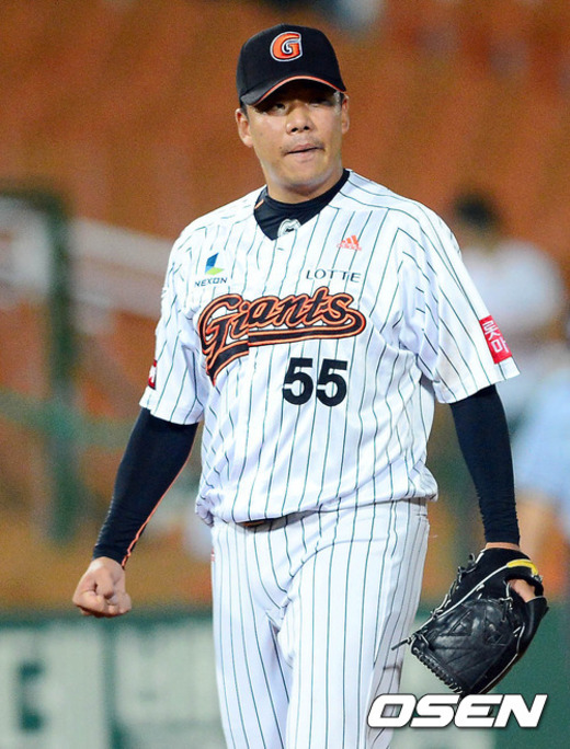 4일 오후 부산 사직구장에서 열린 '2012 팔도 프로야구' 롯데 자이언츠와 KIA 타이거즈의 경기 종료 후 김사율이 주먹을 불끈 쥐며 기뻐하고 있다.