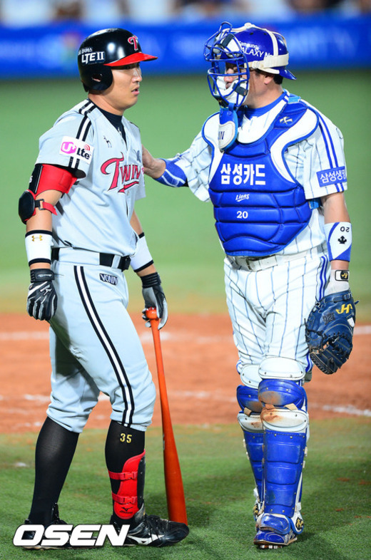 4일 오후 대구 시민구장에서 열린 '2012 팔도 프로야구' 삼성 라이온즈와 LG 트윈스의 경기에서 9회초 1사 주자 3루 이진영이 타석에서 삼성 권혁의 볼을 맞고 화를 내며 마운드쪽으로 걸어가려 하자 진갑용이 말리고 있다.