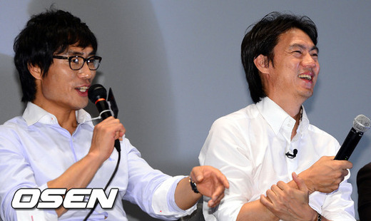 4일 오후 서울 여의도 CGV에서 진행된 '올림픽 축구대표팀 다큐 토크콘서트'에서 홍명보 감독이 김태영 코치의 재치있는 입담에 즐거운 미소를 짓고 있다.