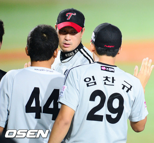 경기를 마치고 LG 봉중근이 동료들과 하이파이브를 하고 있다. / rumi@osen.co.kr