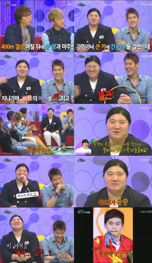 장미란은 당시를 회상하며 "400m 결승전이 끝나고 쑨양이 내 뒤에서 밥을 먹고 있었다. 그런데 가뜩이나 큰 키에 긴 가운을 걸쳤는데 내 어깨를 툭 치고 가더라. 안 그래도 미운데 너무 화가 났다"고 말하며 두 손을 불끈 쥐어 웃음을 자아냈다.