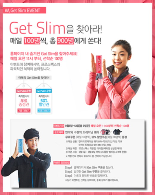 5일부터 13일까지 9일간 진행되는 프로스펙스 ‘Get Slim을 찾아라’ 이벤트는 연아와 수현의 W Slim 트레이닝 웨어를 무료 증정 및 할인 받을 수 있는 특별쿠폰을 제공한다.