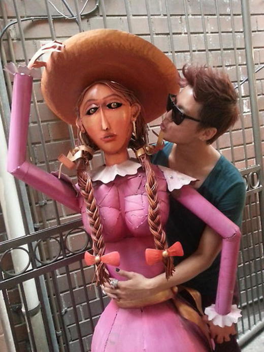김준수는 사진 속에서 실물 크기의 여자 인형을 뒤에 안은 뒤 볼에 뽀뽀를 하려는 듯 입술을 내밀고 있다.