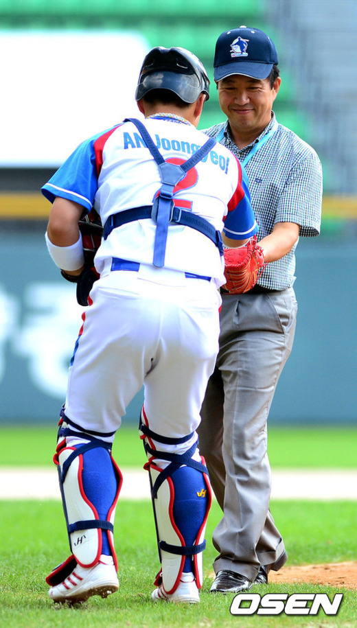 5일 오후 서울 잠실구장에서 열린 '세계청소년야구선수권대회' 한국과 대만의 경기전 강승규 대한야구협회장이 시구를 마치고 한국 포수 안중열과 악수를 나누고 있다.