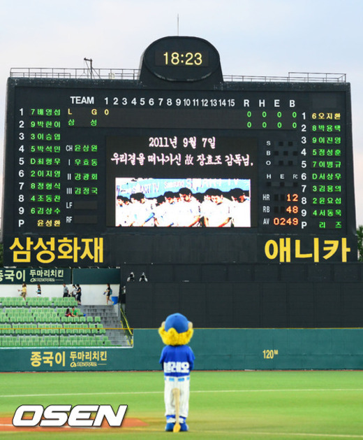5일 오후 대구 시민구장에서 열린 '2012 팔도 프로야구' 삼성 라이온즈와 LG 트윈스의 경기에서 경기 전 故 장효조 감독 1주년 추모행사가 진행되고 있다.