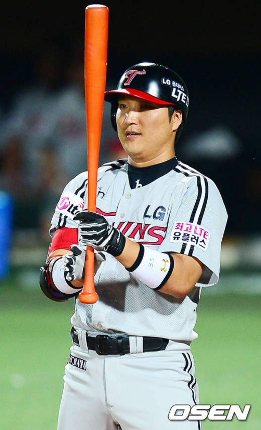 5일 오후 대구 시민구장에서 열린 '2012 팔도 프로야구' 삼성 라이온즈와 LG 트윈스의 경기에서 3회초 2사 주자 1,2루 LG 이진영이 타석에서 자신의 배트를 바라보고 있다.