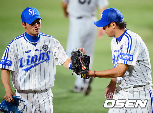 5일 오후 대구 시민구장에서 열린 '2012 팔도 프로야구' 삼성 라이온즈와 LG 트윈스의 경기에서 3회초 2사 주자 1,2루 LG 이진영의 타구를 라인드라이브 아웃시킨 유격수 김상수가 삼성 선발 윤성환과 하이파이브를 하고 있다.