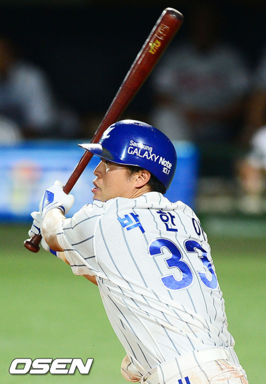 5일 오후 대구 시민구장에서 열린 '2012 팔도 프로야구' 삼성 라이온즈와 LG 트윈스의 경기에서 1회말 리즈의 2구 체인지업에 중전안타를 때리면서 올 시즌 100호 안타를 날린 박한이가 3회말 무사 주자 2루 중견수 플라이타구를 날리고 있다.