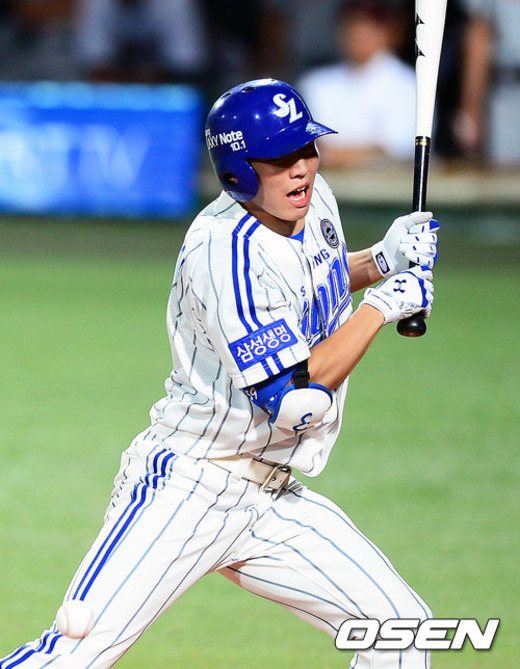5일 오후 대구 시민구장에서 열린 '2012 팔도 프로야구' 삼성 라이온즈와 LG 트윈스의 경기에서 4회말 2사 주자 없는 상황에서 삼성 정형식이 몸에 볼을 맞고 있다.
