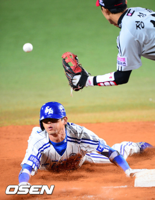 5일 오후 대구 시민구장에서 열린 '2012 팔도 프로야구' 삼성 라이온즈와 LG 트윈스의 경기에서 7회말 1사 주자 2루 삼성 조동찬의 우익수 플라이 타구때 2루 주자 강명구가 3루에 세이프 되고 있다.