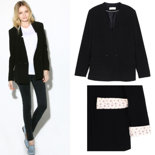 일교차가 심한 간절기에는 손쉽게 입고 벗을 수 있는 재킷 아이템을 제안한다. 덥고 활동적인 낮에는 재킷을 벗고 간편하게, 또한 쌀쌀한 아침 저녁으로는 재킷을 착용함으로써 실용적인 스타일링을 연출 할 수 있다. 사진 속 스탠드 칼라 재킷은 절개 포인트가 돋보이는 칼라가 유니크하다. 포켓 플랩 안쪽과 소매 단 안쪽에 플라워 프린트 안감을 사용하여 재킷 소매를 롤업할 경우, 색다른 느낌으로 연출 할 수 있다.