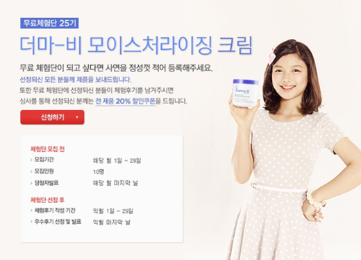 홈페이지를 방문해 우리가족의 민감한 피부에 대한 고민을 등록하고 무료 체험단을 신청하면 추첨을 통해 ‘모이스처라이징 크림’을 무료로 사용할 수 있는 기회를 제공한다. 또한 사용 후기를 등록하면 더마-비 전제품의 20% 할인쿠폰도 증정한다고 밝혔다.