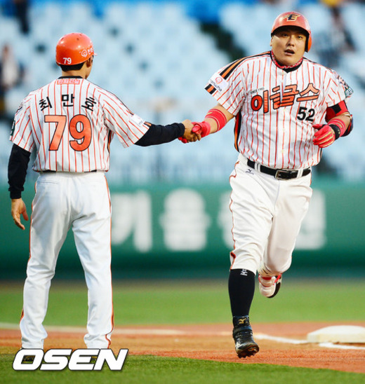 6일 오후 대전 한밭야구장에서 열린 한화 이글스와 롯데 자이언츠의 경기에서 1회말 2사 주자 없는 상황에서 한화 김태균이 좌월 선취 솔로 홈런을 날린 후 3루에서 최만호 코치와 하이파이브를 하고 있다.