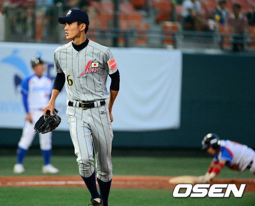 3회말 2사 1루에서 1루주자 유영준이 일본 선발 후지나미의 폭투에 3루로 내달리다 타무라에 태그아웃당하자 후지나미의 안도의 한숨을 쉬며 더그아웃으로 향하고 있다.