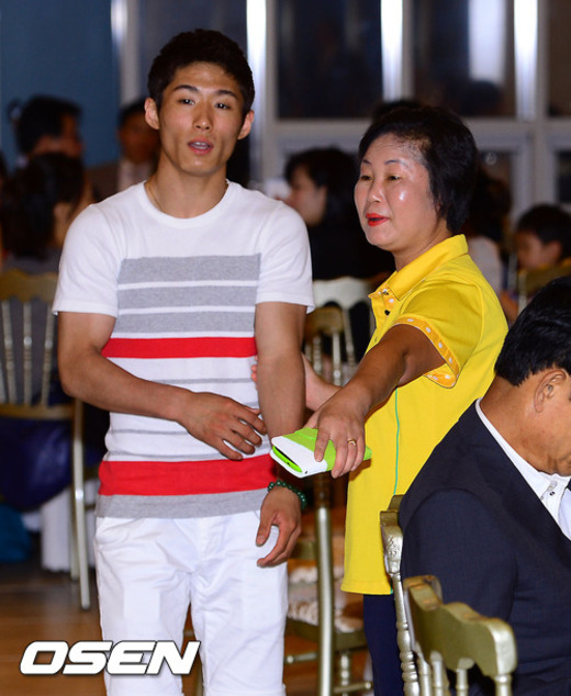6일 오후 서울 한남동 블루스퀘어 삼성전자홀에서 진행된 런던올림픽 체조 금메달 리스트 양학선의 후원식에서 양학선이 어머니 기숙향씨와 함께 참석하고 있다.