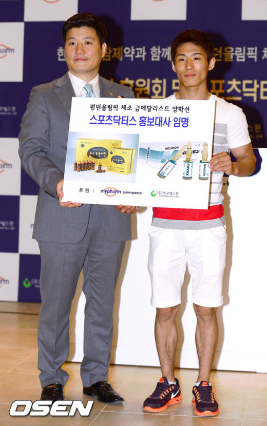 6일 오후 서울 한남동 블루스퀘어 삼성전자홀에서 진행된 런던올림픽 체조 금메달 리스트 양학선의 후원식에서 양학선이 후원금 전달식을 하며 포즈를 취하고 있다