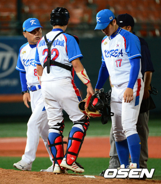 6회초 무사 1,2루에서 한국 이정훈 감독이 마운드에 올라 한승택, 심재민과 이야기를 나누고 있다.