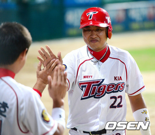 6일 오후 광주 무등구장에서 열린 '2012 팔도 프로야구' KIA 타이거즈와 SK 와이번스의 경기 5회말 2사 1,3루 김선빈의 1타점 적시타에 홈을 밟은 3루주자 김상훈이 덕아웃에서 동료들과 하이파이브를 하고 있다.