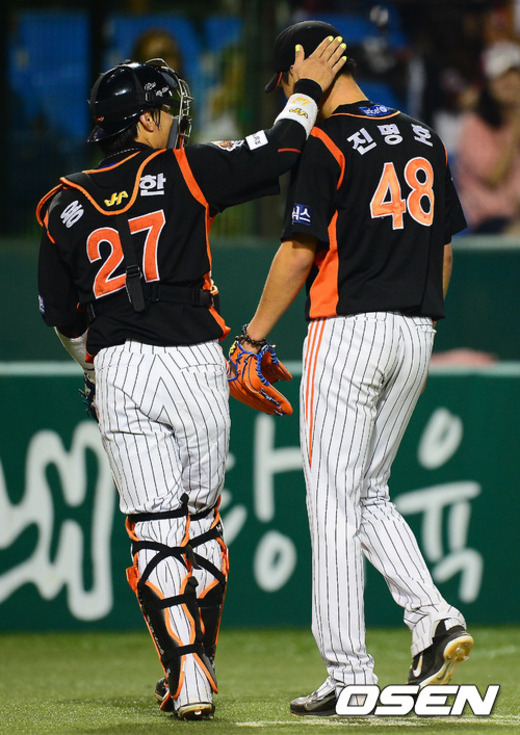 6일 오후 대전 한밭야구장에서 열린 한화 이글스와 롯데 자이언츠의 경기에서 5회를 마치고 롯데 용덕한 포수가 진명호 투수를 격려하고 있다.