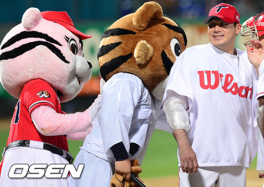 6일 오후 광주 무등구장에서 열린 '2012 팔도 프로야구' KIA 타이거즈와 SK 와이번스의 경기 종료 후 서재응이 동료들과 하이파이브를 하면서 미소를 짓고 있다.