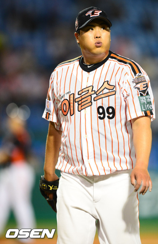 6일 오후 대전 한밭야구장에서 열린 한화 이글스와 롯데 자이언츠의 경기에서 8회 현재까지 무실점으로 롯데를 막은 한화 선발 류현진이 덕아웃으로 향하며 큰 숨을 내쉬고 있다.