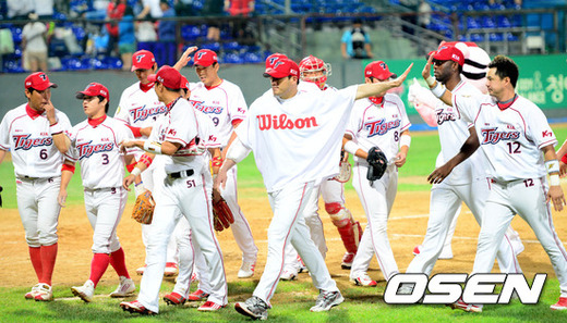 6일 오후 광주 무등구장에서 열린 '2012 팔도 프로야구' KIA 타이거즈와 SK 와이번스의 경기 종료 후 KIA 선수들이 그라운드를 빠져나가고 있다.