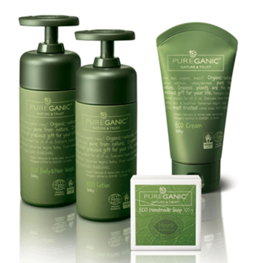 퓨어가닉의 에코라인은 '에코 로션 300ml, 바디&헤어 워시 300ml, 크림 100g, 다이애퍼크림 100g, 콤팩트파우더 25g, 스타치 파우더 80g, 핸드메이드솝 100g'으로 구성됐다.