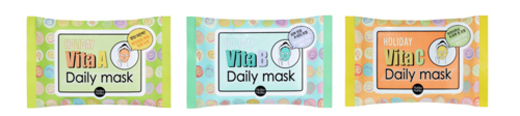 홀리카 홀리카의 ‘홀리데이 비타 데일리 마스크’는 자연에서 추출한 비타민으로 영양과 탄력을 부여해 주는 A, 트러블 진정과 피지 조절이 가능한 B, 브라이트닝 & 피부 톤 조절을 해주는 C 타입까지 3가지로 나뉘어 출시되어 현재 자신의 피부 타입에 따라 골라 사용할 수 있다. 또한 홀리카 홀리카에서 최초로 출시한 간편하게 뽑아쓰는 티슈 타입의 마스크 제품으로 간편하게 휴대가 가능하여 평상시 뿐 아니라 여행이나 출장 등 외출 시에도 사용이 용이하다.