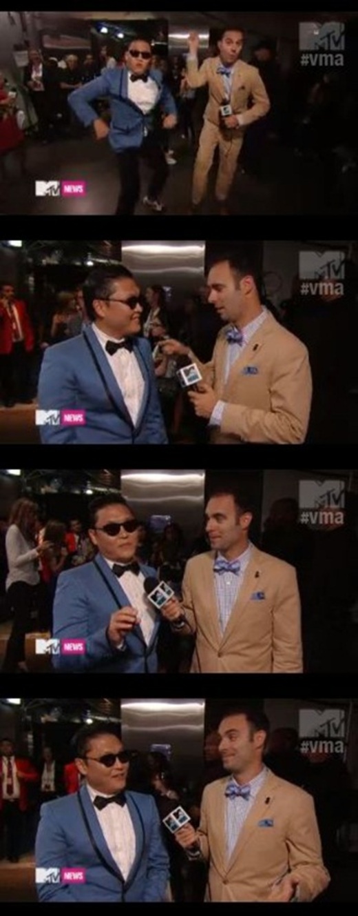 가수 싸이가 MTV 비디오 뮤직 어워드 무대에 오른 직후 백스테이지에서 MTV 리포터와의 인터뷰를 갖고 "내가 이 자리에 있다는 것이 믿기지 않는다"고 소감을 밝혔다.