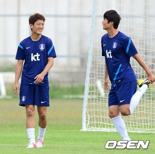 이청용과 기성용이 스트레칭 훈련 중 이야기를 하고 있다. / sunday@osen.co.kr