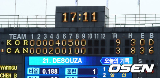 한국은 7일 목동구장에서 열린 제25회 세계청소년야구선수권대회 2라운드 마지막 경기인 캐나다전에서 4회말 2점을 먼저 내줬으나 5회 4득점에 성공하는 등 9-2 완승을 거뒀다. 안타는 3개에 불과했으나 사사구만 13개(4사구)를 얻어내며 상대 마운드 난조를 파고들었다.