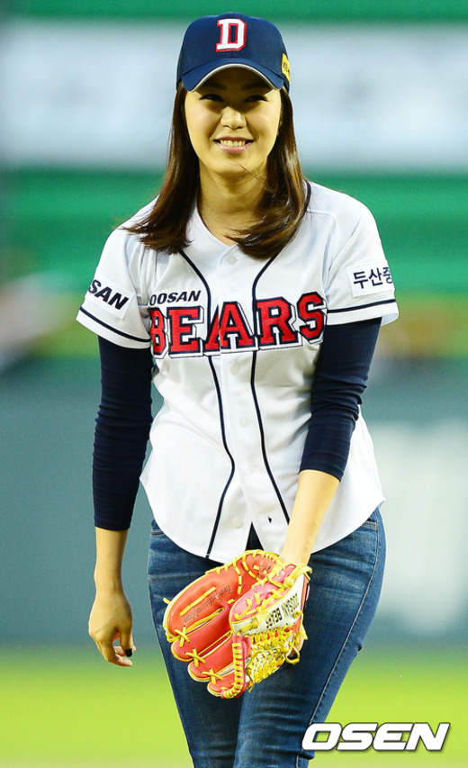 7일 오후 서울 잠실구장에서 열린 '2012 팔도 프로야구' 두산 베어스와 넥센 히어로즈 경기에서 SBS 김주희 아나운서가 시구를 마친 후 환하게 미소짓고 있다.