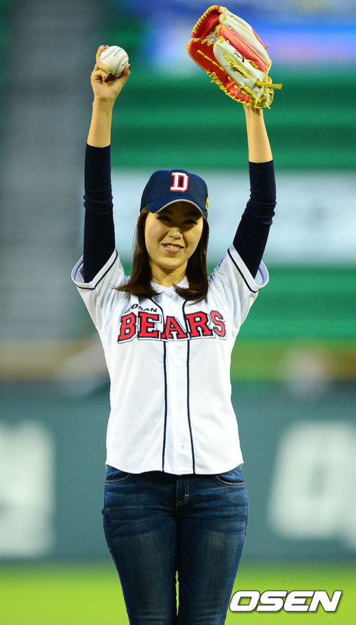 7일 오후 서울 잠실구장에서 열린 '2012 팔도 프로야구' 두산 베어스와 넥센 히어로즈 경기에서 SBS 김주희 아나운서가 시구 전 인사를 하고 있다.