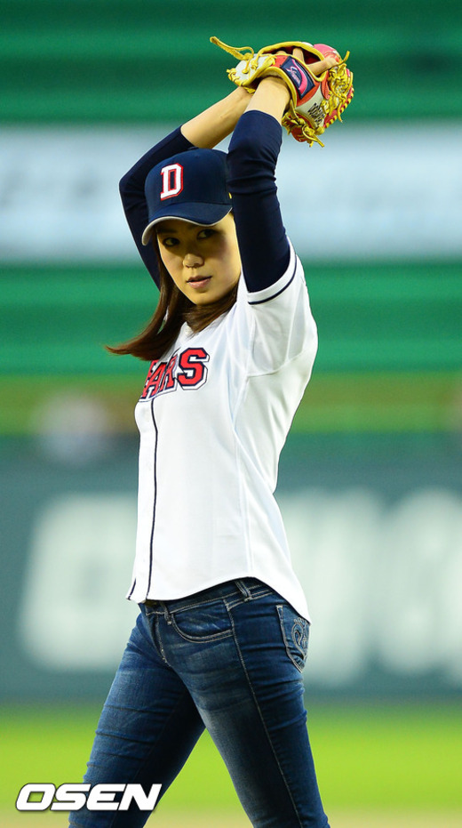 7일 오후 서울 잠실구장에서 열린 '2012 팔도 프로야구' 두산 베어스와 넥센 히어로즈 경기에서 SBS 김주희 아나운서가 시구를 하고 있다.