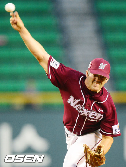 7일 오후 서울 잠실구장에서 열린 '2012 팔도 프로야구' 두산 베어스와 넥센 히어로즈 경기에서 나이트가 힘차게 공을 뿌리고 있다.