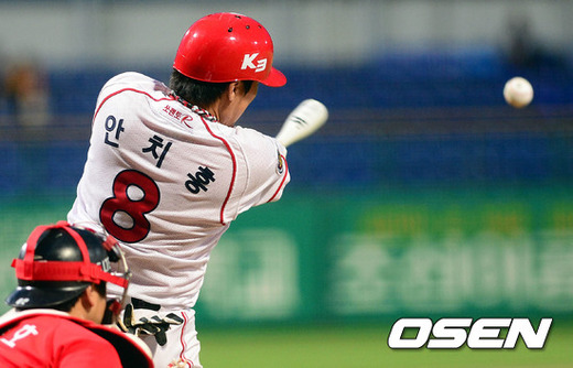 7일 오후 광주 무등구장에서 열린 '2012 팔도 프로야구' KIA 타이거즈와 SK 와이번스의 경기 1회말 1사 3루 안치홍이 1타점 2루타를 치고 있다.