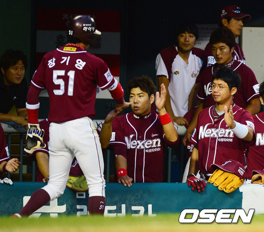 7일 오후 서울 잠실구장에서 열린 '2012 팔도 프로야구' 두산 베어스와 넥센 히어로즈 경기에서 1회초 2사 주자 3루 넥센 박병호의 3루수 앞 내야 1타점 적시타때 홈을 밟은 장기영이 덕아웃에서 동료들과 힘차게 공을 뿌리고 있다.
