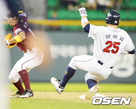 7일 오후 서울 잠실구장에서 열린 '2012 팔도 프로야구' 두산 베어스와 넥센 히어로즈 경기에서 2회말 1사 주자 1,2루 두산 이원석의 3루수 앞 병살타 때 넥센 2루수 서건창이 1루 주자 양의지를 2루에서 포스아웃 시킨 후 1루로 송구하고 있다.