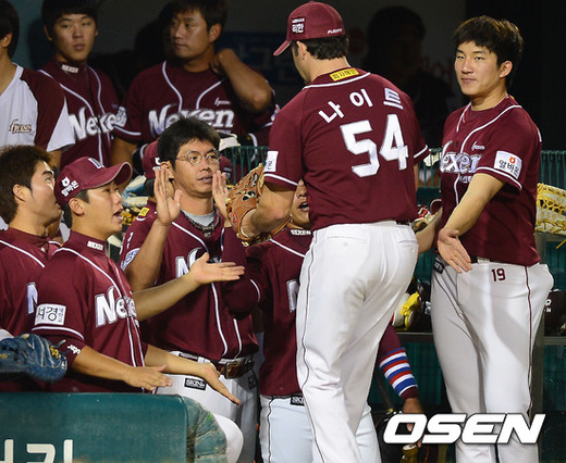 7일 오후 서울 잠실구장에서 열린 '2012 팔도 프로야구' 두산 베어스와 넥센 히어로즈 경기에서 2회를 마친넥센 나이트가 덕아웃에서 동료들과 기쁨을 나누고 있다.