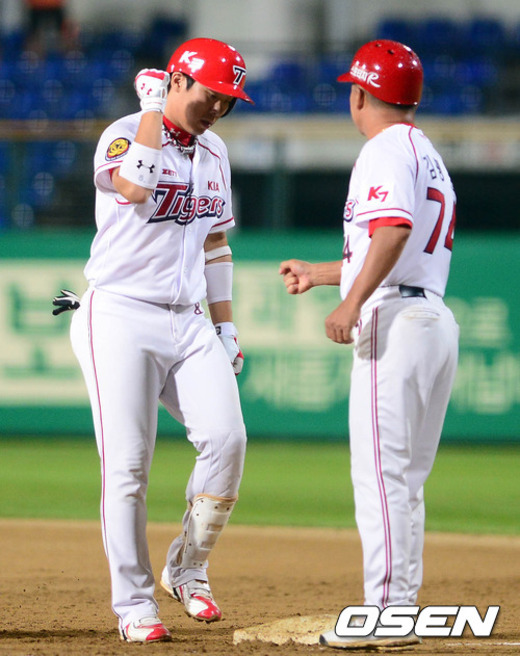 7일 오후 광주 무등구장에서 열린 '2012 팔도 프로야구' KIA 타이거즈와 SK 와이번스의 경기 2회말 1사 1,2루 안치홍이 1타점 적시타를 친 후 김평호 코치와 하이파이브를 하고 있다.