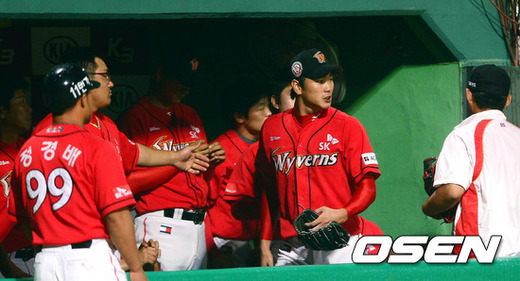 7일 오후 광주 무등구장에서 열린 '2012 팔도 프로야구' KIA 타이거즈와 SK 와이번스의 경기 2회말을 마친 김광현이 덕아웃으로 향하며 화난 표정을 짓고 있다.