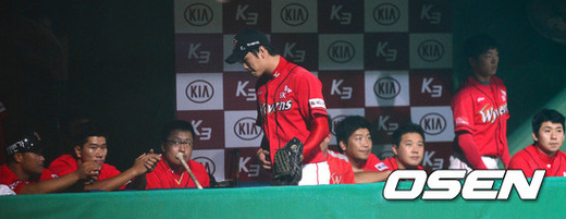 7일 오후 광주 무등구장에서 열린 '2012 팔도 프로야구' KIA 타이거즈와 SK 와이번스의 경기 3회말 1사 1,2루 김주형에게 스리런포를 내준 김광현이 강판당한 후 덕아웃으로 향하고 있다.