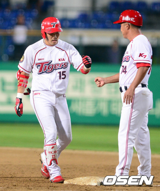 7일 오후 광주 무등구장에서 열린 '2012 팔도 프로야구' KIA 타이거즈와 SK 와이번스의 경기 3회말 1사 3루 이용규가 1타점 적시타를 친 후 김평호 코치와 하이파이브를 하고 있다.