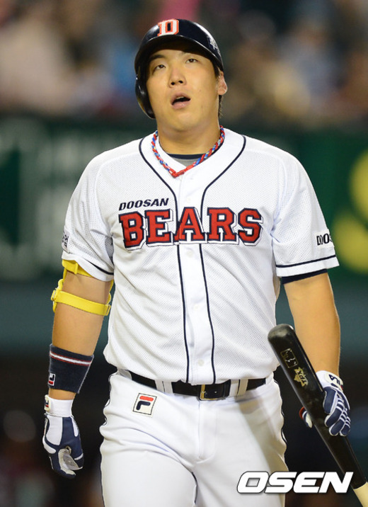 7일 오후 서울 잠실구장에서 열린 '2012 팔도 프로야구' 두산 베어스와 넥센 히어로즈 경기에서 6회말 선두타자 두산 김현수가 3타석에서 연속 삼진아웃을 당한 후 아쉬워하고 있다.