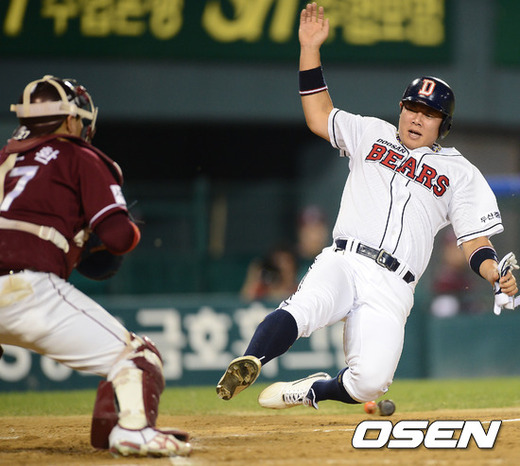 7일 오후 서울 잠실구장에서 열린 '2012 팔도 프로야구' 두산 베어스와 넥센 히어로즈 경기에서 6회말 2사 주자 1,2루 두산 이원석이 좌익수 앞 1루타를 날렸을때 2루 주자 윤석민이 홈으로 몸을 던졌으나 넥센 허도환 포수에 태그아웃을 당하고 있다.