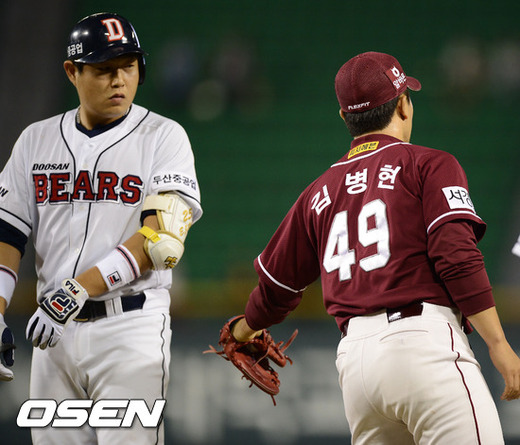 7일 오후 서울 잠실구장에서 열린 '2012 팔도 프로야구' 두산 베어스와 넥센 히어로즈 경기 8회말 2사 주자 1루 두산 양의지가 1루수 오른쪽 1루타를 날린 1루에 서있을때 공을 받은 넥센 김병현이 양의지를 향해 태그 동작을 취하고 있다.