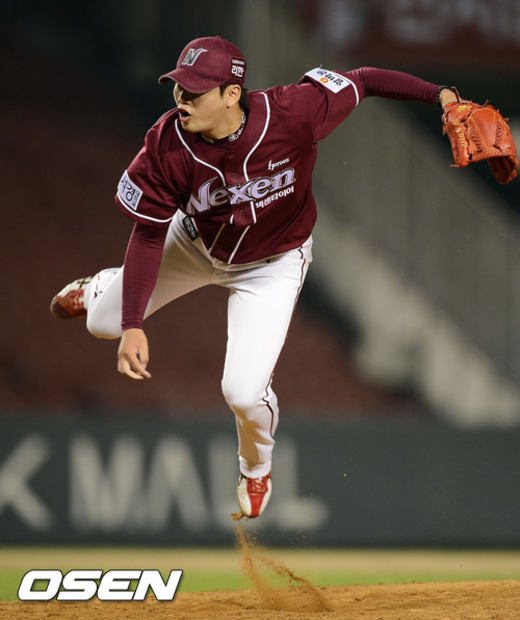 7일 오후 서울 잠실구장에서 열린 '2012 팔도 프로야구' 두산 베어스와 넥센 히어로즈 경기 8회말 2사 주자 1,3루 두산 이원석 타석에서 마운드에 오른 손승락이 힘차게 공을 뿌리고 있다.